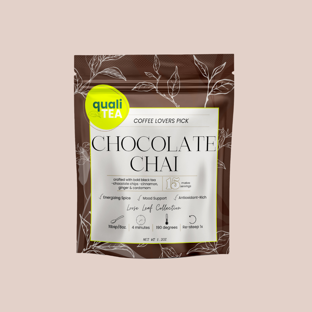 Indulge your senses with Chocolate Chai loose leaf tea, a luxurious blend that marries the rich, velvety flavor of real chocolate chips with the exotic warmth of cardamom. This decadent tea features a robust base of black tea, perfectly balanced with the aromatic spices of traditional chai, creating a symphony of flavors that is both comforting and invigorating. Each sip offers a harmonious blend of sweet chocolate and spicy cardamom, making it the perfect treat for chilly afternoons or cozy evenings. Elevate your tea experience with Chocolate Chai, a delightful escape into a world of indulgence and warmth.