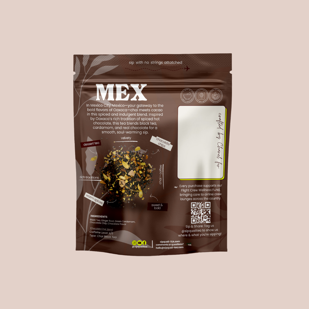 Black Tea, Ginger Root, Cinnamon Chips, Cardamom, Cloves, Pink Peppercorn, and Chocolate Pieces CONTAINS: MILK & SOY