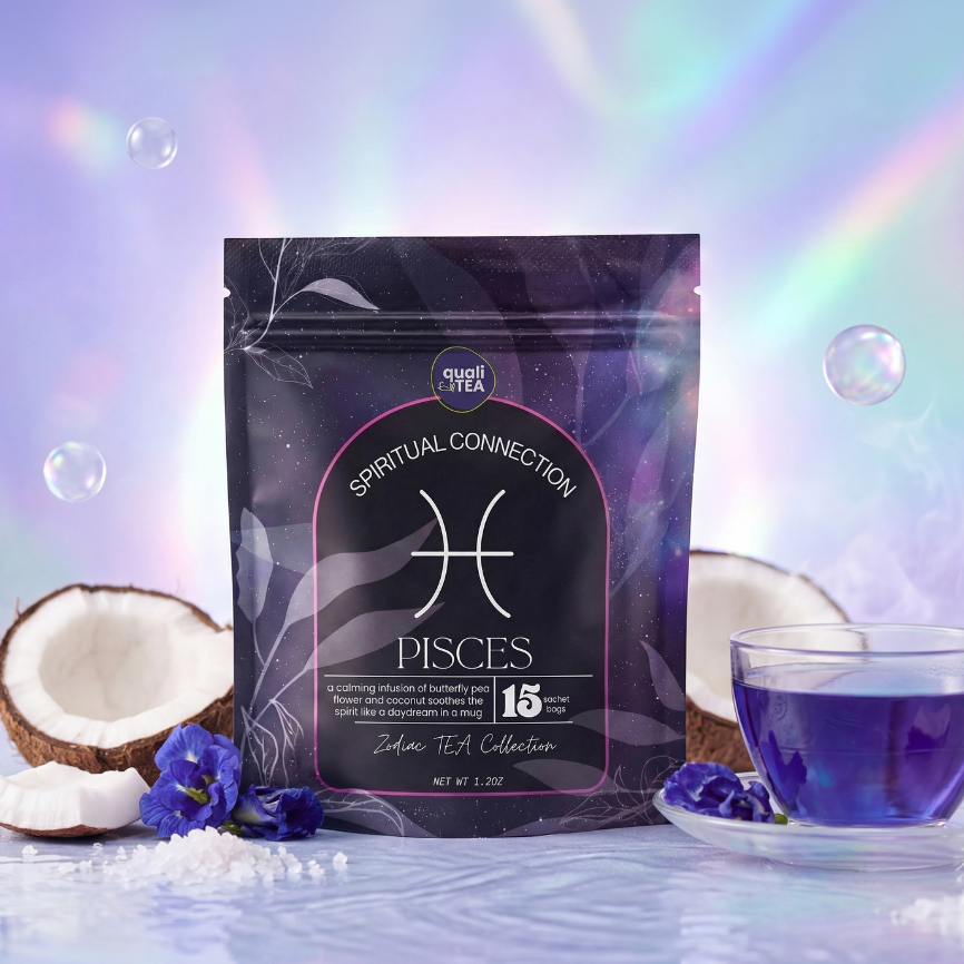 Ruled by Neptune, Pisces dreams with  a soul made of water and wonder. This ocean-blue blend was crafted as a ritual of gentle surrender: a calming infusion of butterfly pea flower, blue lotus, coconut, and sea minerals that soothes the spirit and restores emotional balance. Each sip is a soft tide of intuition, faith, and peace — a reminder to rest in your flow.